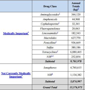 But here’s a summary of antibiotic use in animal agriculture:—9.7 million kilograms of medically important drugs (that’s about 20 million pounds) and another 5.9 million kilograms of antibiotics that are not important medically. (about 13 million pounds).